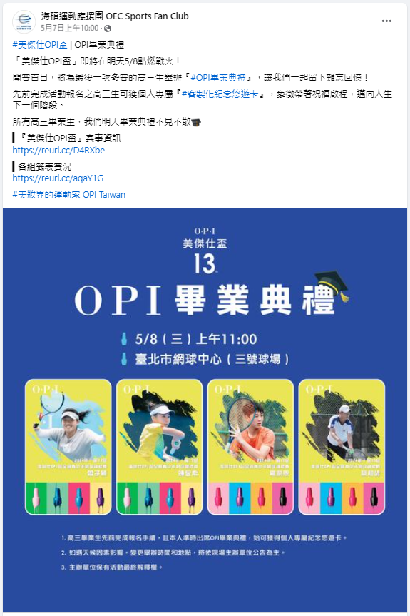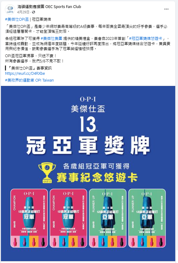 2024年首度與網球職業賽 「華國三太子國際男子網球挑戰賽」和「台塑盃國際網球錦標賽」攜手合作,舉辦「OPI未來之星」活動,18歲組單打冠軍選手可獲得 「2024台塑盃國際職業網球錦標賽」第一站單打會內賽外卡,目的為幫助具潛力青少年好手,在邁向職業路上完成接軌,更鼓勵青少年好手向上挑戰職業舞台,爭取職業積分和獎金。
